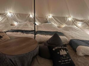 4人用のコットンベルテントにダブルベッドが2つ、さらにワンちゃん用ベッドがあります。