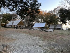 日が暮れてから到着したのですが、ライトアップされたテントと焚火が、とてもオシャレ!というのが到着しての第一印象です。